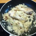 Voeg nu in de lege koekenpan de kippenbouillon, rijst en een snufje zout. Breng aan de kook en roer door elkaar. Maak de kuiltjes in de rijst en leg daat de drumsticks in. Dek de pan af met een deksel. Kook zachtjes gedurende 15-20 minuten. Als de rijst al de bouillon heeft opgenomen en de rijst is nog niet gaar voeg dan een scheutje water toe.