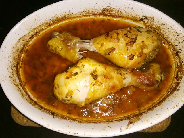 3. Verwarm de oven voor op 200°. Zet de drumsticks ongeveer een uur in de oven tot het vlees los laat van het bot. Halverwege de baktijd nog een keer de drumsticks bedruipen met de marinade.