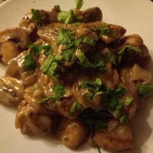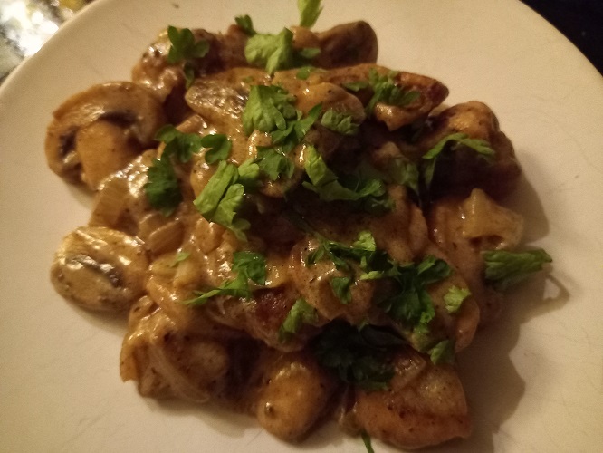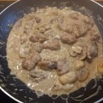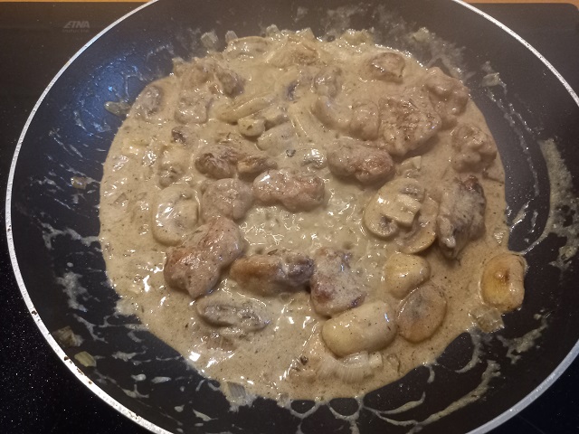 Voeg de wijn toe aan de pan schraap eventuele aanbaksels los van de bodem. Voeg dan de tijm, kippenbouillon, mosterd en de kookroom toe. Breng aan de kook en laat 5 minuten zachtjes koken. Voeg het maïzenapapje toe. Breng weer zachtjes aan de kook en voeg de kipstukjes toe. Laat een minuut of 5 zachtjes koken. Proef de saus en breng eventueel verder op smaak met zout en peper.