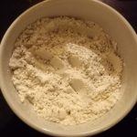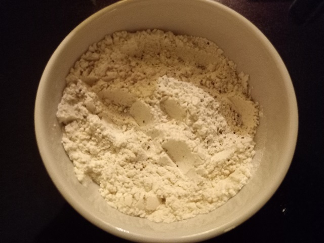 Meng in een kommetje de bloem, zout, peper en knoflookpoeder.