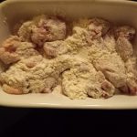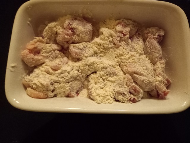 Strooi het bloemmengsel over de kipstukjes en meng door elkaar zodat alle stukjes van de bloem zijn bedekt met het bloemmengsel. Doe het mengsel in een zeef en klop het overtollige bloemmengsel van de kipblokjes.