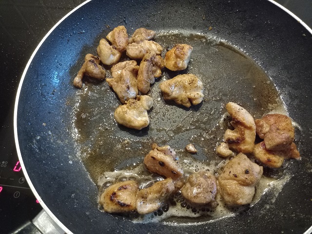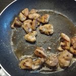 Verhit de boter met 1 el. olijfolie op middelhoog vuur. Bak de kipblokjes aan alle kanten gedurende ongeveer een minuut of 5. Haal de kipblokjes uit de pan en bewaar in aluminiumfolie.