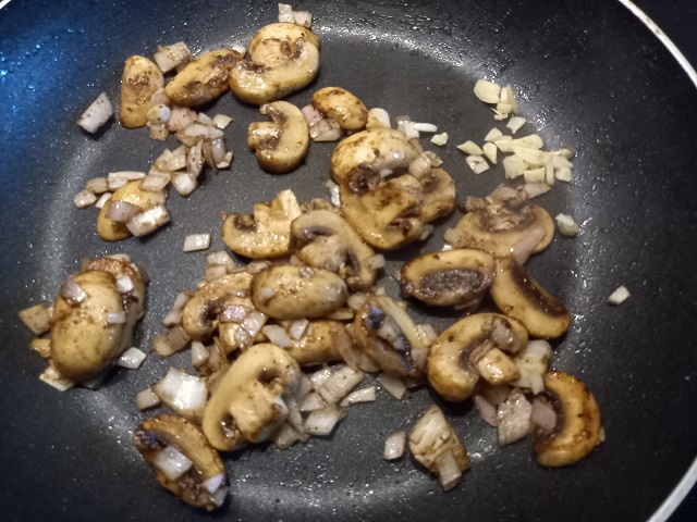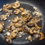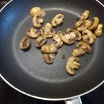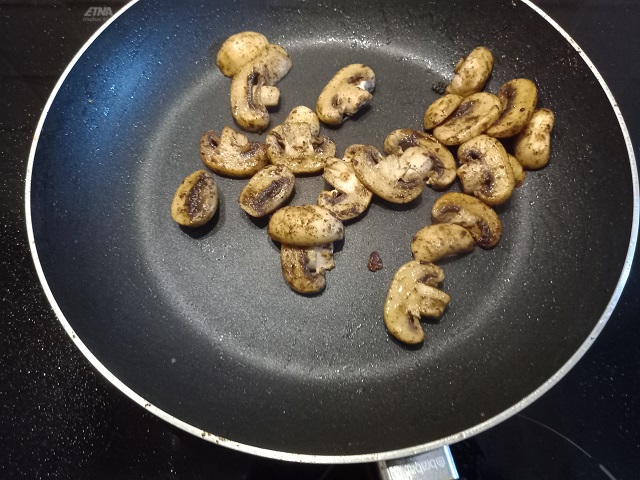 Verhit de overige lepel olijfolie in dezelfde pan en bak de champignons.