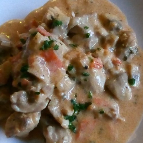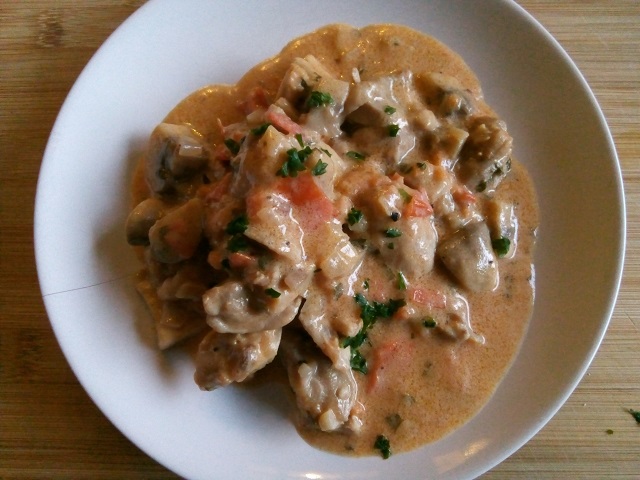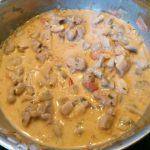 5. Voeg de crème fraîche toe en roer goed door elkaar. Laat even weer warm worden. Proef en breng eventueel verder op smaak met wat zout en peper.