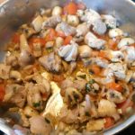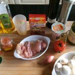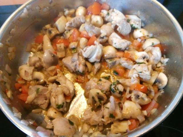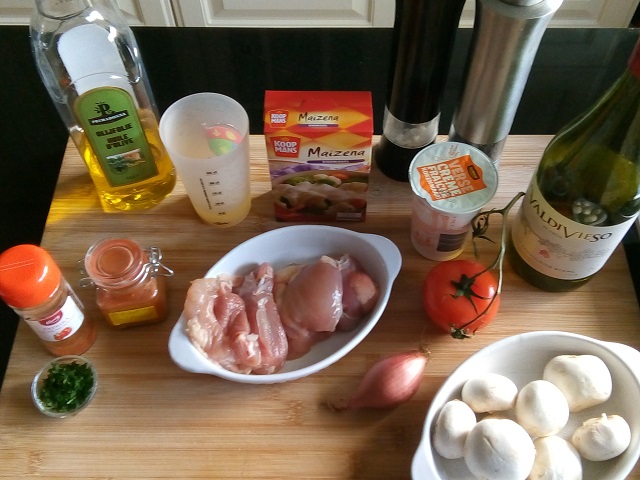 1. Zet alle ingrediënten klaar. Pel en snipper de sjalot en de knoflook. Snij de kippendij in niet te kleine blokjes. Snij de tomaat in blokjes en verwijder het vocht, kroontje en de pitjes. Hak de peterselie fijn.