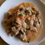 4. Voeg de knoflook en de tomatenblokjes toe alsook de helft van de peterselie. Voeg de witte wijn toe. Maak een papje van de bouillon en de maïzena. Voeg dit aan de pan toe en meng goed door elkaar. Doe de deksel op de pan en laat 15 minuten rustig stoven.