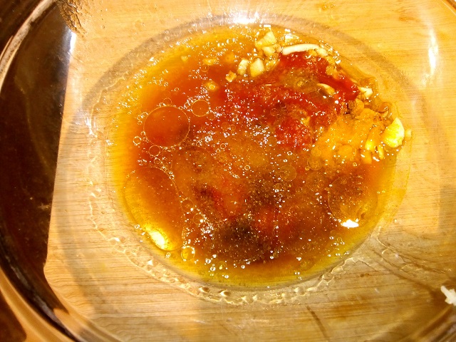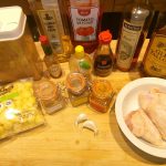 Meng in een ruime kom: de knoflook, olijfolie, ketchup, sojasaus, komijn. koriander, kurkuma, witte wijnazijn, citroensap, rietsuiker, whisky, tabasco, zout, peper. Voeg de kipvleugels toe. Meng goed door elkaar. Dek de kom af met huishoudfolie en laat minimaal 4 uur marineren in de koelkast. Verwarm de oven voor op 220°.