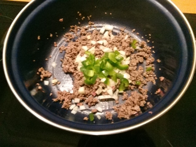 3. Voeg de ui en de paprikablokjes toe en bak dit gedurende 5 minuten.