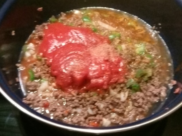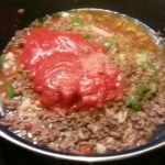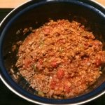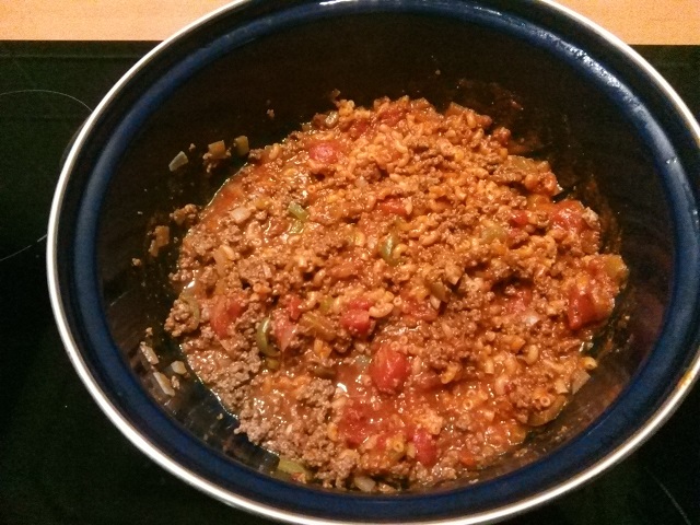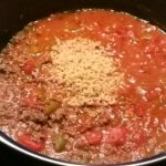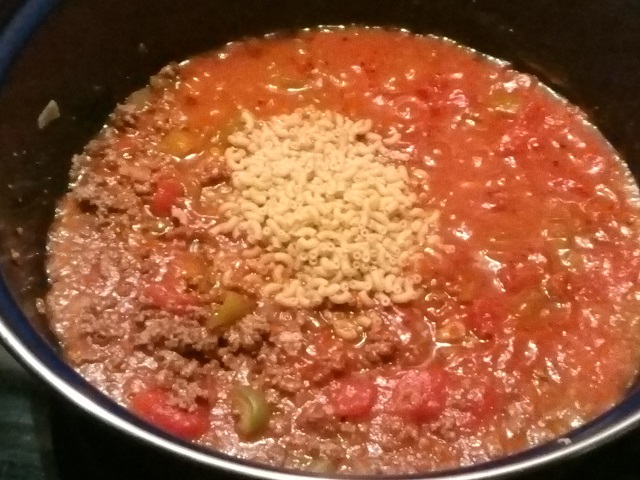 4. Voeg alle overige ingrediënten toe behalve de macaroni. Doe de deksel op de pan en laat 20 minuten zachtjes pruttelen.