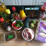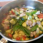 1. Zet alle ingrediënten klaar. Snijd de paprika in stukjes. Snijd de courgette in blokjes. Haal de peultjes af. Pel en snipper de knoflook. Rasp de gember. Snijd de kippendij in stukjes.
