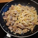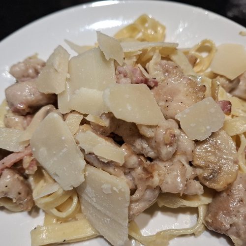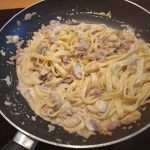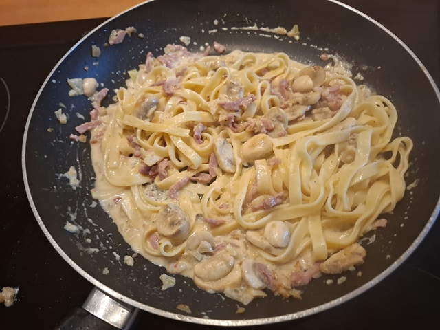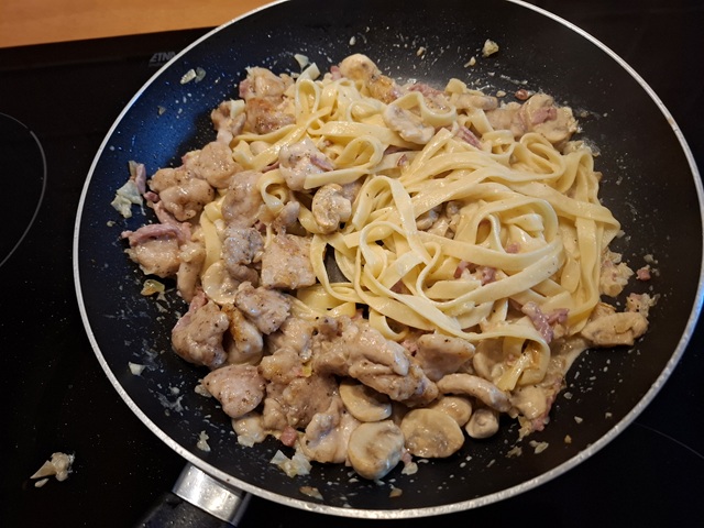 Voeg de pasta toe en strooi er de geraspte kaas over. Men goed door elkaar met behulp van een keukentang. Is de saus te dik geworden voeg dan een klein scheutje melk toe. Roer goed door elkaar.