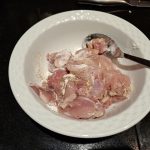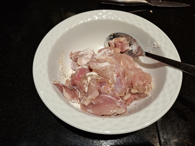 Meng de kipblokjes met de maïzena, zout, peper en knoflookpoeder.