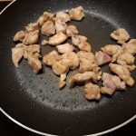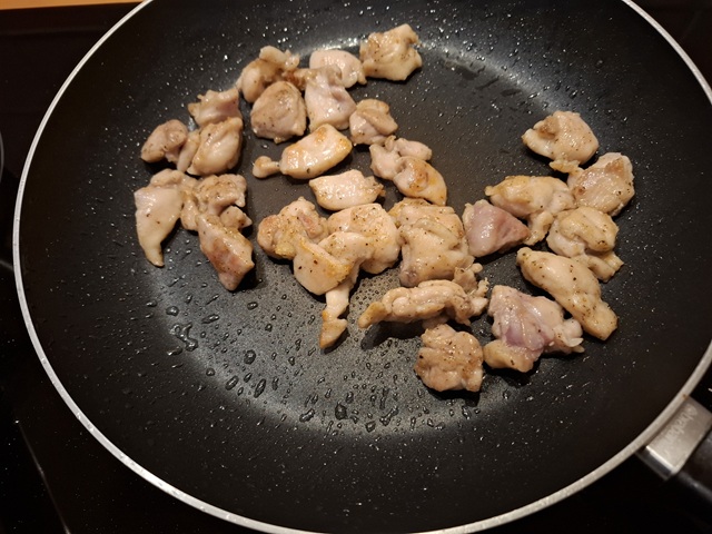 Verhit de olie in een koekenpan en bak de kipblokjes rondom aan. Bak de kip gaar in 6-7 minuten. Haal de kip uit de pan en bewaar op een bordje onder aluminiumfolie.