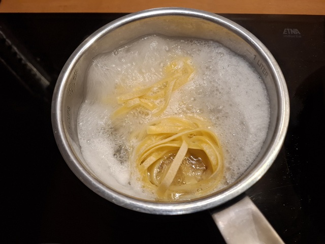 Kook de pasta volgens aanwijzingen op de verpakking in gezouten water. Na het afgieten de pasta terug in de pan en besprenkel met wat olie. Roer door elkaar. Dit voorkomt het plakken van de pasta.