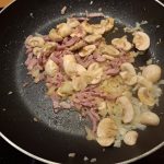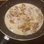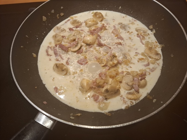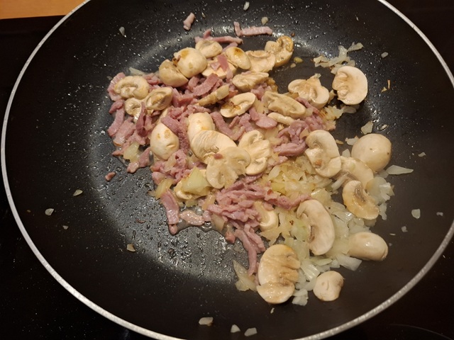 Fruit de ui in de achter gebleven olie. Is er nog weinig olie in de pan voeg dan nog een scheutje toe en fruit de ui. Voeg de spekjes en de champignons toe. Voeg de knoflook en wat zout en peper toe. Wees voorzichtig met het zout, want de spekjes zijn ook zout.