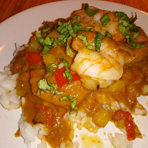 Verdeel de curry over de borden, garneer met wat basilicum en geef er witte rijst bij.