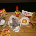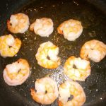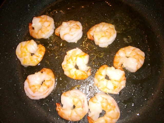 2. Verhit een scheutje olijfolie in een koekenpan en bak de garnalen om en om tot ze mooi van kleur zijn. Ongeveer 3 minuten per kant. Haal de garnalen uit de pan en bewaar in een schaaltje.