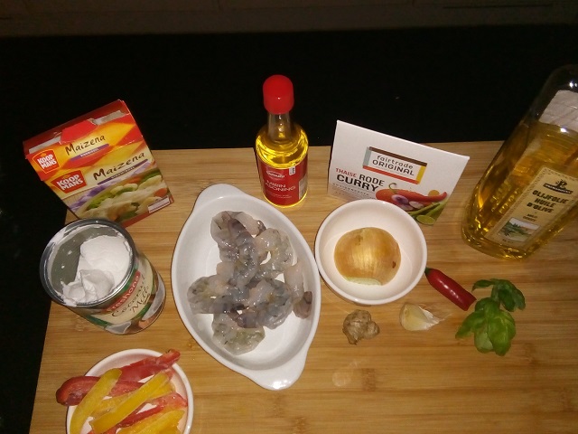 1. Zet alle ingrediënten klaar. Pel en snipper de ui en de knoflook. Snijd de paprika's in blokjes. Rasp de gember. Pel de garnalen en verwijder het darmkanaaltje. Spoel ze goed af met koud water. Snijd de basilicum wat fijner.