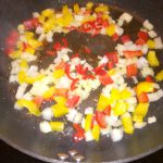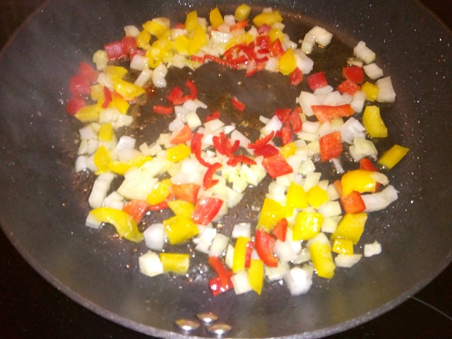 3. Voeg nog een scheutje olie toe aan de koekenpan en fruit de ui met de paprikablokjes. Bak ongeveer 5 minuten tot de ui glazig is en de paprika's bijna gaar zijn. Voeg dan de knoflook toe en laat deze even mee fruiten. Haal de groentes uit de pan en zet apart.