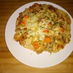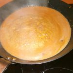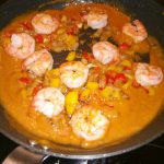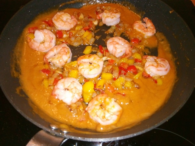 4. Zet de warmtebron wat lager en voeg er de kokosmelk, de currypasta en de mirin door. Maak de maïzena aan met wat water en meng door elkaar. Voeg het papje toe aan de saus en laat een minuut of 5 doorkoken zodat de saus dikker wordt.