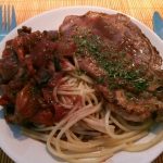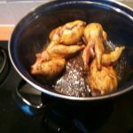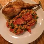 Verdeel de spaanse rijst over de borden en leg er een kwartel bij.