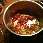 Ontvel de tomaten en snijd ze in blokjes. Snijd de lenteui in ringetjes. Maak de paprika schoon en snijd in reepjes. Doe het zelfde met de rode peper. Haal het velletje van de chorizo en snijd in plakjes.