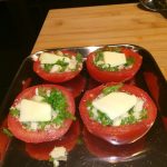Leg een klein klontje boter op elke halve tomaat. Leg de gevulde tomaten op een ovenplaatje en laat deze een minuut of 20 garen in de oven.