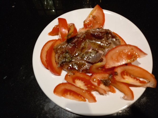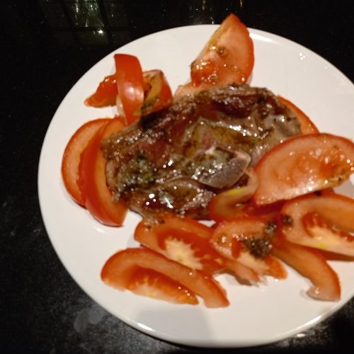 Verdeel de koteletten over de borden. Giet de gesmolten kruidenboter hier over en geef er de tomatenpartjes bij.
