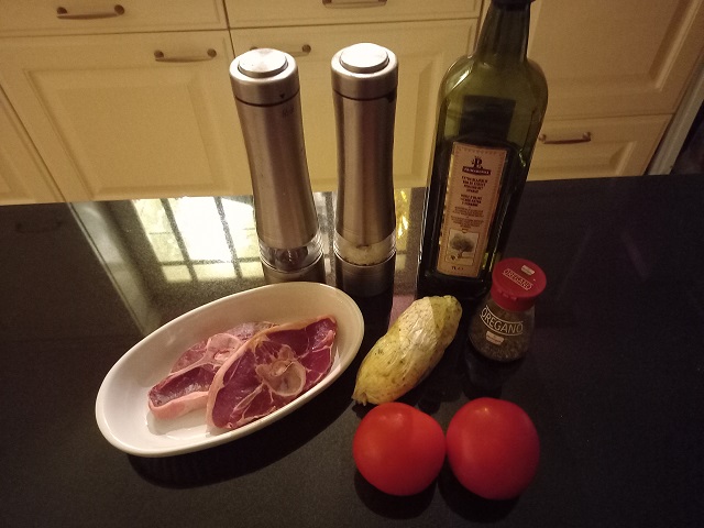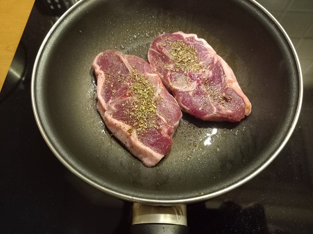 Verhit de olijfolie in een koekenpan en bak de koteletten. Strooi wat zout, peper en oregano over de koteletten.