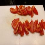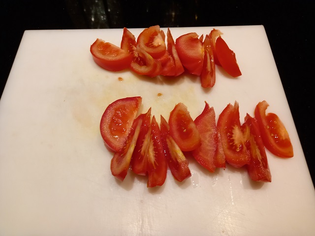 Verwijder de kroontjes van de tomaten en snijd ze in partjes.