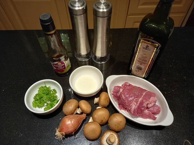 Zet alle ingrediënten klaar. Pel en snipper de sjalot. Veeg de champignons schoon met een stukje keukenpapier. Snijd het harde gedeelte van het steeltje en snijd de champignons in plakjes. Bestrooi de longhaas met zout en peper. Snijd de peterselie klein.