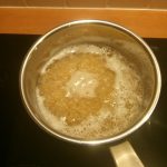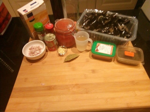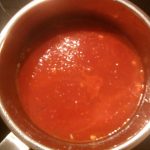 Zeef het mosselvocht en doe in een pan, samen met de tomatenblokjes, tomatenpuree, paprikapoeder, cayennepeper en het geperste knoflookteentje.