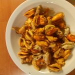 Verdeel de macaroni over de borden en garneer met de mosselen in de schelp