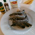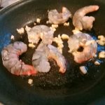 Verwarm de olie in een koekenpan of wok en bak de gamba's 2 minuten aan beide zijden. Voeg de gesnipperde knoflook toe. Voeg enkele druppels tabasco toe.