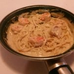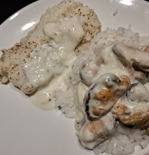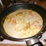 Voeg de kokosmelk en de kerriepoeder toe aan de gamba's. Zet het vuur lager en laat de melk wat inkoken. Proef de saus. Voeg eventueel nog wat kerriepoeder en/of tabasco toe.