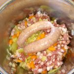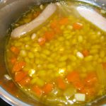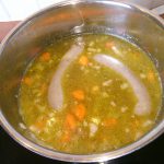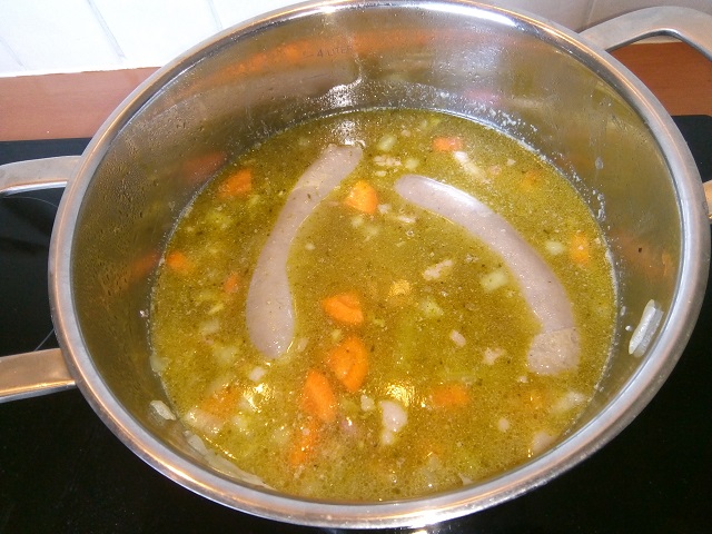 Voeg dan de spekjes en de worstjes toe. Giet er de groentebouillon bij plus een extra liter water. Voeg een beetje zout en wat peper toe. Let op met de hoeveelheid zout want de spekblokjes bevatten ook vrij veel zout.
