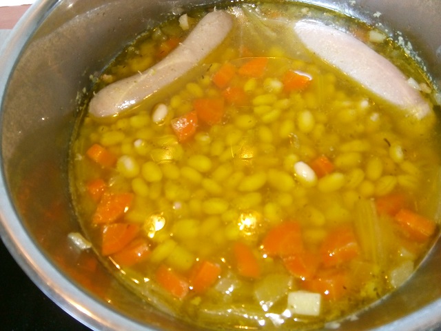Laat een minuut of 20 zachtjes koken. Voeg dan de witte bonen en de pasta toe . Laat zachtjes koken tot de pasta gaar is.