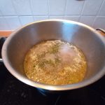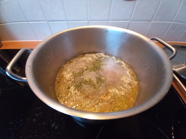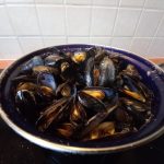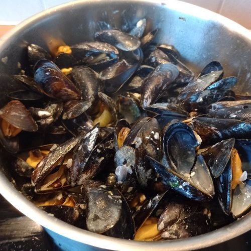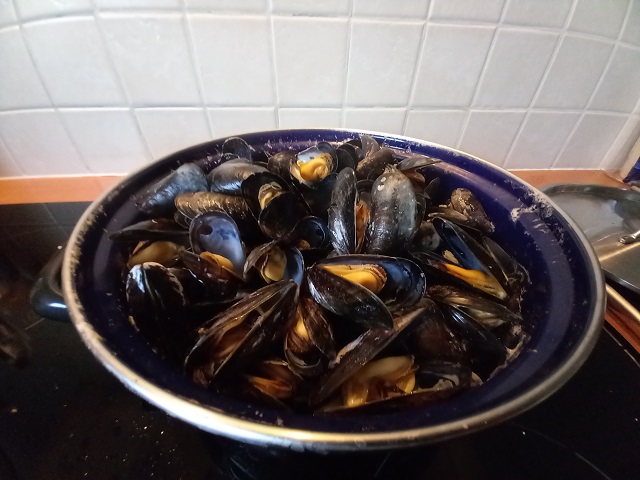 3. Kook intussen de mosselen in een andere grote pan met het deksel op de pan. Giet de mosselen af maar vang het kookvocht op. Dit wordt nog gebruikt.