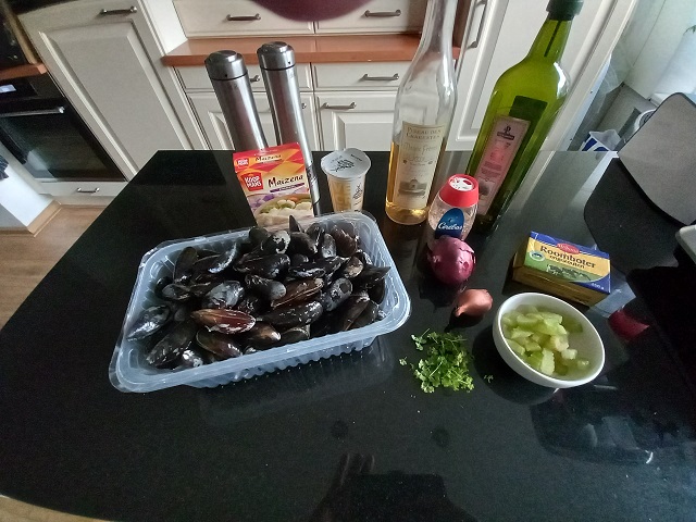 1. Zet alle ingrediënten klaar. Doe de mosselen in een bak met schoon water. Pel en snipper de sjalot en de ui. Snijd de stengel bleekselderij in boogjes.