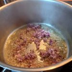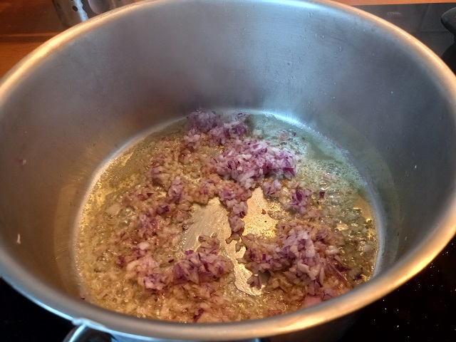 2. Verhit de olie met de boter in een pan en fruit de ui en de sjalot.