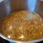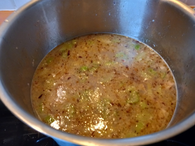4. Meng de maïzena met een beetje water en maak er een papje van. Voeg het kookvocht toe aan de pan met de ui en sjalot. Voeg ook de bleekselderij toe. Voeg het maïzenapapje, zout en peper toe. Laat 5 minuten koken.