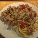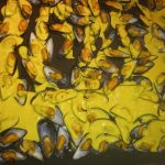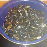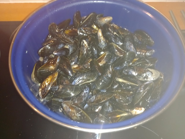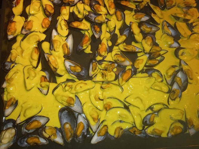 7. Giet de saus over de mosselen en laat nog een paar minuten doorwarmen in de oven. Zet het bakblik op tafel op een paar onderzetters. Geef er stokbrood of frites bij.
