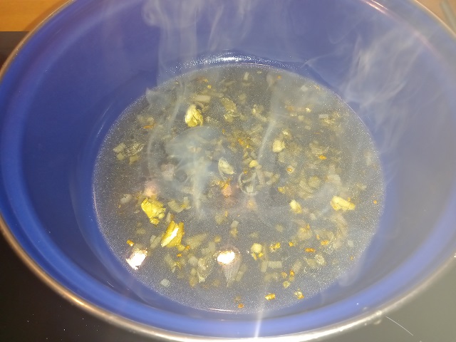 2. Voeg het kruidentuiltje en de mosselen toe. Doe het deksel op de pan en kook op hoog vuur. Schud af en toe om. Zodra de mosselen zich hebben geopend. Giet af door een zeef en bewaar het kookvocht. Bekleed een bakplaat met aluminiumfolie. Haal de helft van de schelpen eraf en leg de mossel op de bakplaat. Doe dit met alle mosselen. Zet in de oven om ze warm te houden.