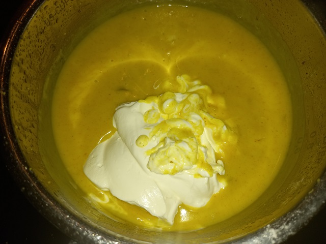 6. Voeg de melk toe en 20 cl van het mosselvocht. Voeg de crème fraîche toe. Roer het geheel goed door elkaar.