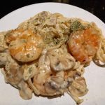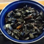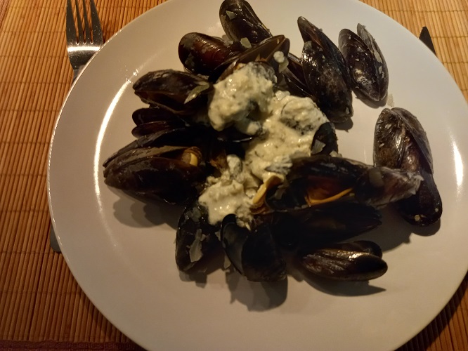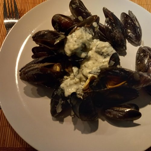 Schep de mosselen, zodra ze open zijn op de borden en giet de roomsaus over de mosselen.