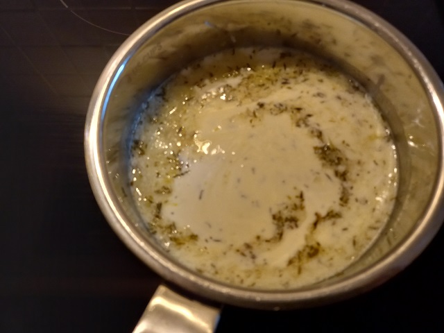 Voeg vervolgens een half glas wijn, de kookroom en de naaldjes van 2 takjes tijm toe. Laat de saus rustig inkoken.