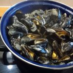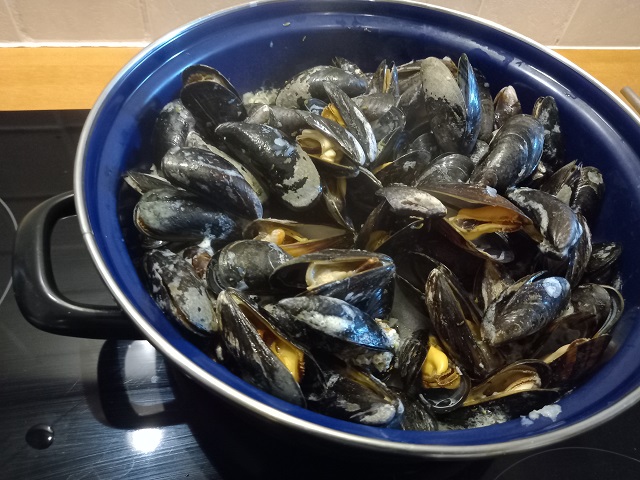Was de mosselen in koud water en gooi beschadigde exemplaren en mosselen die, na een tik op het aanrecht, niet volledig sluiten weg.