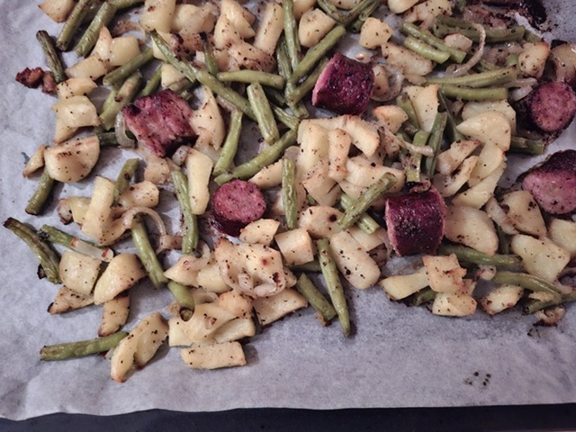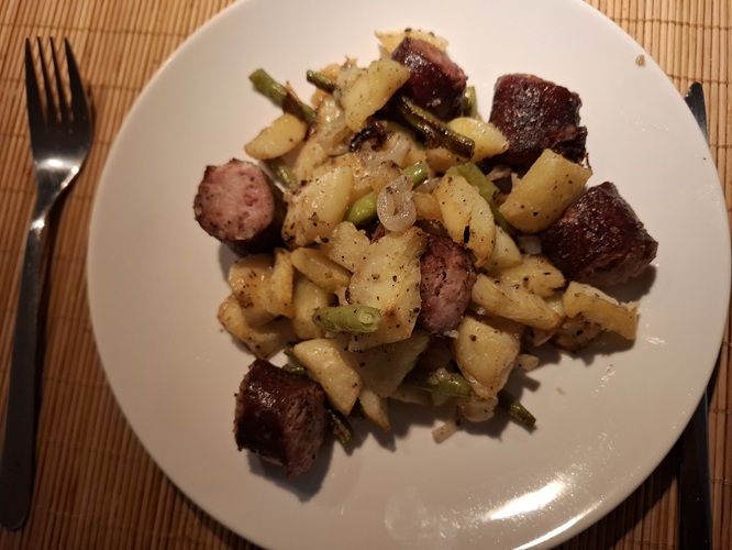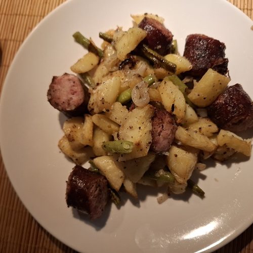 Doe de aardappels, sperziebonen, ui en de worst in een ruime kom.
