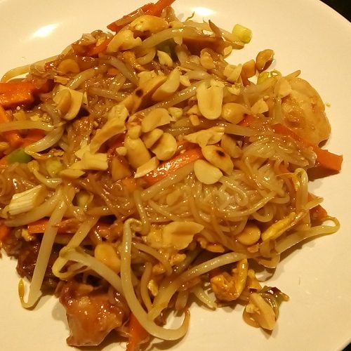 Voeg de helft van de pinda's en de lente ui toe aan de pan en roerbak het geheel nog een minuut of 2. Verdeel over de borden en garneer met de rest van de pinda's. Indien je van koriander houd kun je deze ook nog gebruiken als garnering.