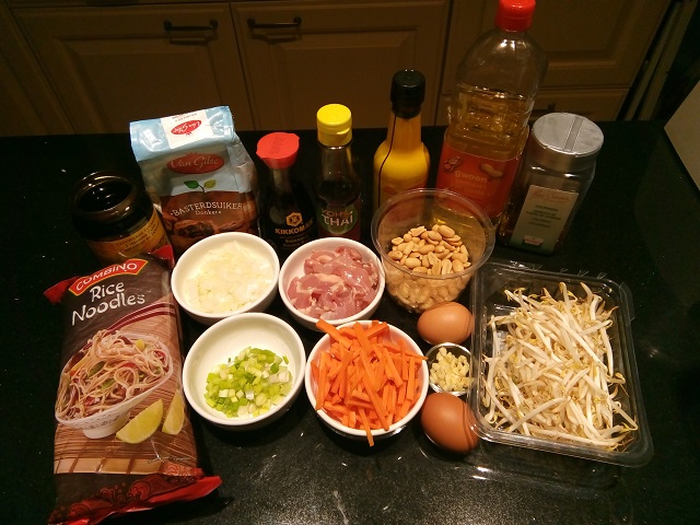 Zet alle ingrediënten klaar. Pel en snipper de ui en de knoflook. Snijd de wortel in julienne. Snijd de kip in blokjes. Snijd de lente ui in smalle ringetjes.